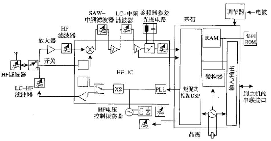 圖1藍(lán)牙無(wú)線電系統(tǒng)(最少兩個(gè)芯片)的典型方案右邊為基帶處理器,左邊為高頻模塊,附加濾波器和天線開(kāi)關(guān)元件