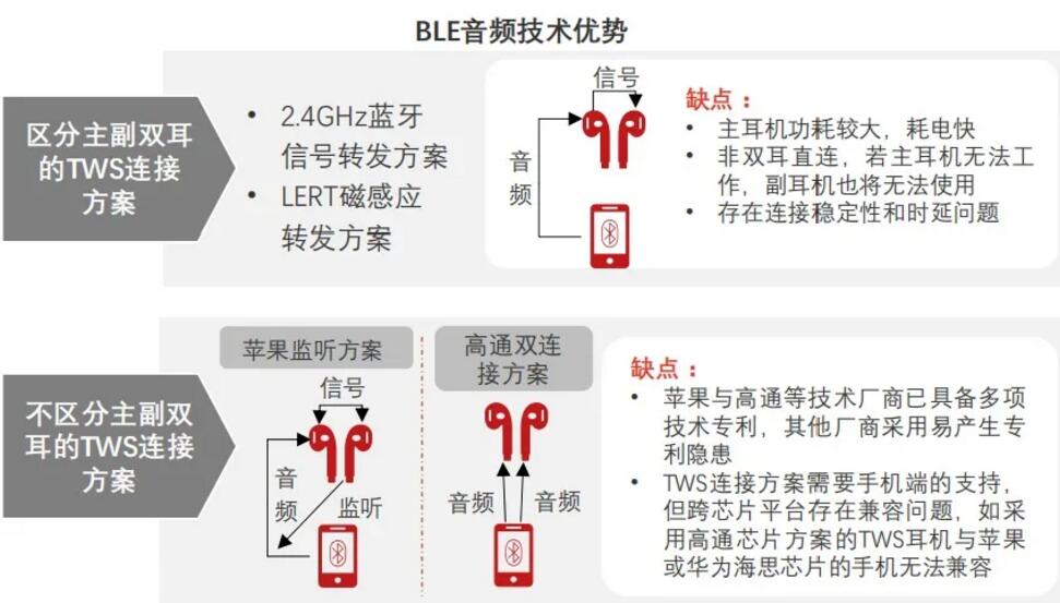 藍牙芯片的重要應用場景。早期藍牙標準不支持無線多路直連,無法實現(xiàn)雙耳同步傳輸,普通藍牙耳機僅能實現(xiàn)一對一連接,蘋果采用Snoop監(jiān)聽模式,在一只耳機進行藍牙音頻傳輸時,另一只耳機利用它們之間的私有協(xié)議對其進行監(jiān)聽,達到1對2連接的目的。由于蘋果對監(jiān)聽模式進行專利封鎖,早期安卓TWS廠商主要采用relay轉(zhuǎn)發(fā)模式,將音頻從手機傳至左耳設備,再由左耳轉(zhuǎn)發(fā)至右耳,但該方案存在諸多劣勢,例如(1)音頻傳輸過程較長造成連接不穩(wěn)定;(2)延遲問題嚴重;(3)接受音頻傳輸?shù)闹饔枚鷻C的電池功耗顯著高于輔用耳機。安卓TWS廠商受限于技術實力,TWS耳機產(chǎn)品音頻傳輸體驗亟待提升。