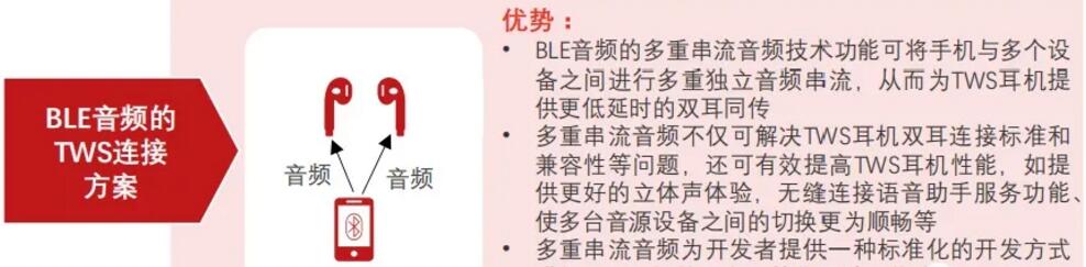 BLEA標準采用多重串流音頻技術,可實現(xiàn)無線多路直聯(lián),單一音頻輸出設備與一個或多個音頻接收設備之間,可同步進行多重且獨立的音頻串流傳輸。BLEA標準的頒布打破蘋果TWS專利封鎖,解決TWS耳機雙耳直連的標準問題和兼容性問題,為安卓TWS廠商提供標準化的TWS耳機開發(fā)方式,有助于釋放安卓TWS廠商的生產(chǎn)力。