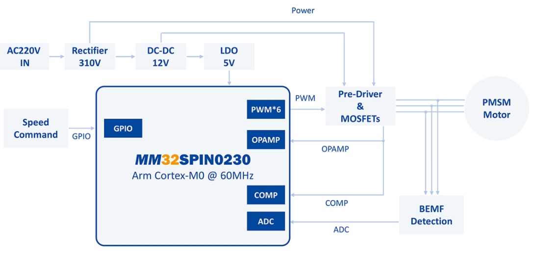 MM32SPIN0230,它采用Arm® Cortex-M0內核,最高工作頻率可達60MHz,內置32KB Flash和4KB SRAM,具備1路12位模數(shù)轉換器ADC,支持11通道,采樣速率達1Msps,以及4個通用定時器和1個專為電機控制設計的PWM高級定時器。此外,它還支持UART/SPI通信,并內置2個運放、2個比較器,專為電機應用而設計。