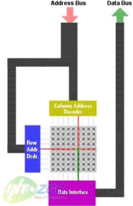 需要注意的是RAM內(nèi)的部存儲信息的矩陣并不是一個(gè)正方形的,也就是行和列的數(shù)目不是相同的--行的數(shù)目比列的數(shù)目少(DRAM)。