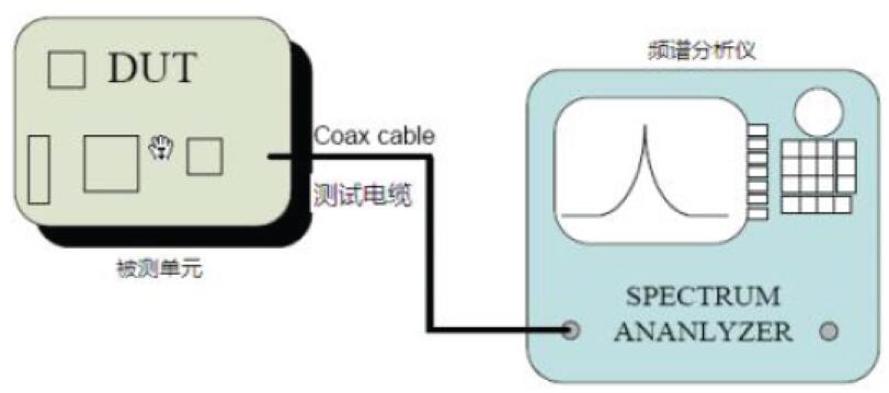 射頻發(fā)射信號(hào)通過(guò)產(chǎn)品的天線耦合到頻譜分析儀。測(cè)試裝置連接如下: