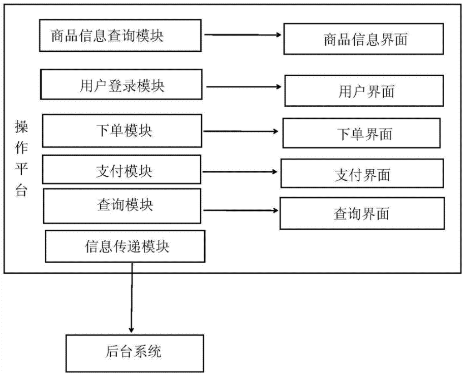 基于實(shí)物展示的共享網(wǎng)絡(luò)銷售柜,該銷售柜柜設(shè)有多個(gè)展示臺(tái)和操作電腦;展示臺(tái)用以擺放展示商品,展示柜分為多層多格,用以存放不同的物品;操作電腦連通公共網(wǎng)絡(luò),具有主機(jī)和操作平臺(tái);操作平臺(tái)上設(shè)有商品信息查詢模塊,用戶登錄模塊,下單模塊,支付模塊,查詢模塊和信息傳遞模塊;買家通過展示臺(tái)選中商品后,在操作平臺(tái)上登錄商品信息查詢模塊,通過該商品信息查詢模塊的商品信息界面了解商品信息,通過用戶登錄模塊的用戶界面登錄,通過下單模塊的下單界面購買商品,通過支付模塊的支付界面完成付款和打印發(fā)票,通過查詢模塊的查詢界面查詢購買信息;信息傳遞模塊將用戶購買信息通過網(wǎng)絡(luò)發(fā)送給商家;商家接收到購買信息后,通過物流將產(chǎn)品發(fā)送給買家。