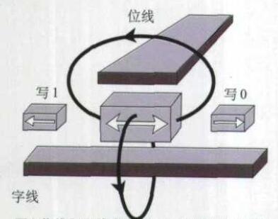 MRAM單元自由層產(chǎn)生的合成磁場(chǎng)來實(shí)現(xiàn)。在運(yùn)行時(shí),利用編碼排序使二維MRAM陣列中只有一條字線和一條位線通過電流(如圖1),因而只有一個(gè)MRAM單元被選中,這時(shí)可以有兩種寫人狀態(tài):