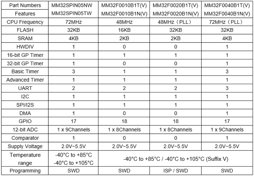 MM32F0020 的封裝相同,但在性能和外設(shè)上還是有不少不同之處的,部分可以參照下表所示。此外 MM32F0040 還增加了 MM32F0020 所不具有的外設(shè)功能,比如硬件除法器、比較器、32 位定時(shí)器等。所以項(xiàng)目之初做好評估,在硬件設(shè)計(jì)時(shí)做好兼容,在替換的時(shí)候,需要結(jié)合項(xiàng)目實(shí)際的硬件需求,做好對比;滿足條件的情況下,可以進(jìn)行升級。更多詳情可咨詢靈動(dòng)微官方代理商英尚微電子。