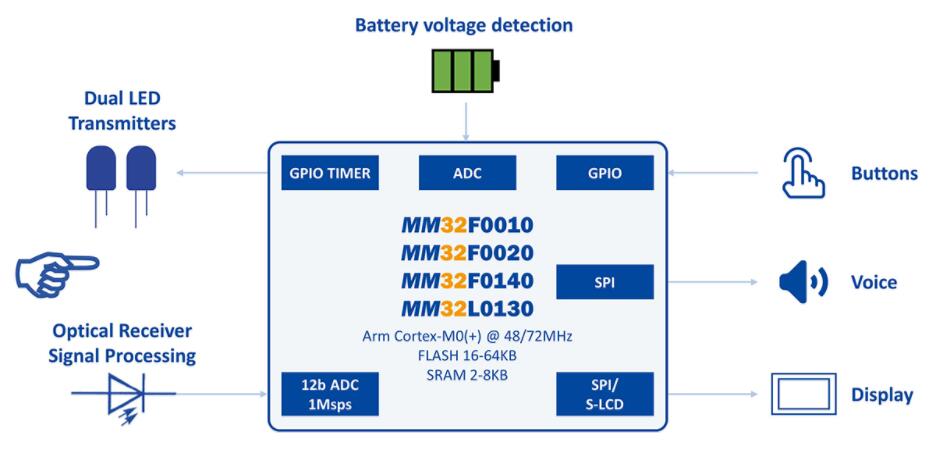 -MM32L0130集成了段碼LCD控制器,且待機功耗可低至100nA,可進一步降低血氧儀的整體功耗,實現(xiàn)更長久和易用的用戶體驗