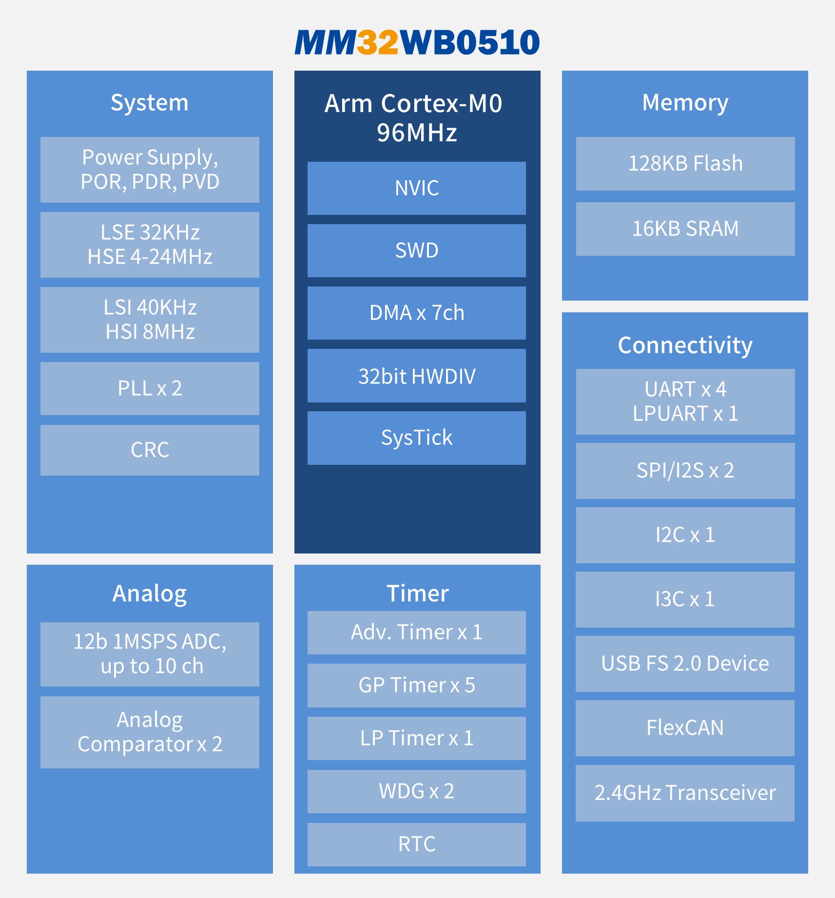 MM32WB0510搭載Arm Cortex-M0內核,主頻可達96MHz,內置128KB Flash和16KB SRAM,并集成了USB和FlexCAN接口,面向智能家居,鍵鼠,消防現(xiàn)場部件,電力電子,汽車OBU,汽車傳感器等無線和多接口類型的應用??蛇x封裝形式包括:LQFP64,LQFP48,QFN48和QFN32。