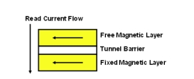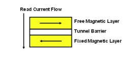 存儲(chǔ)位的置“0”狀態(tài)或置“1”狀態(tài)正是由自由層的極性來確定的。自由層極性和固定層極性一致時(shí)(指向相同方向),穿越MTJ棧層的阻抗很低(請(qǐng)參閱圖1)。自由層極性和固定層極性180度相反時(shí)(指向相反方向),穿越MTJ棧層的阻抗就很高(請(qǐng)參閱圖2)。由MTJ堆棧中的低阻抗和高阻抗來確定是否將位元讀為“0”或“1”。