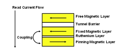 飛思卡爾半導(dǎo)體還通過增加兩個(gè)附加層來改進(jìn)固定磁性層。在固定層下面增加了一層釕(Ru)。而在Ru層下面又增加了另一層稱為牽制層(pinning layer)的磁性層。固定層和牽制層的極性相反,將會(huì)引起很強(qiáng)的耦合。該強(qiáng)耦合使固定層的極性保持鎖定,因此不會(huì)在編程操作過程中引起誤反轉(zhuǎn)(圖4)。