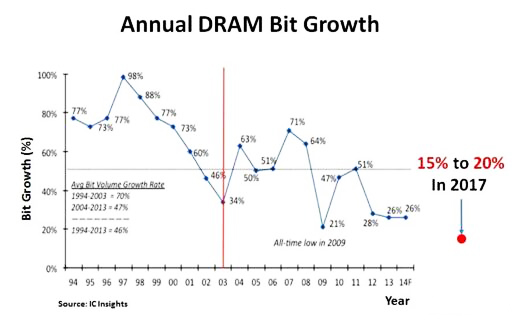 美光(Micron)表示,2017年DRAM供給位元預(yù)計成長15-20%,可說是近20年來最低的位元成長率(bit growth)。如此低的位元成長率,主要是因為DRAM微縮限制。市場上有很長一段時間都沒有任何有關(guān)DRAM微縮的消息了。當供給位元成長低于45%時,這時就是賣方的市場了。因此,DRAM的寡頭壟斷、低位元成長率,以及制造擴張遲緩,導(dǎo)致長期的供應(yīng)吃緊。最終的局面可能就是DRAM的價格不斷上漲,而供應(yīng)面卻不會有任何改變。