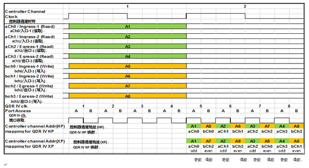統(tǒng)計流四通道和一秒(處理器)更新四通道接口作為應(yīng)用通道。QDR IV控制器采用帶有為QDR IV端口A和端口B定義的專用四通道端口界面的4:1/1:4通道復(fù)用/解復(fù)用功能。QDR-IV控制器以固定順序?qū)νǖ肋M行復(fù)用和解復(fù)用,應(yīng)用端和以4X時鐘頻率運行的QDR IV設(shè)備端之間的順序為ch0、ch1、ch2和ch3。圖3為所假設(shè)的QDR-IV控制器順序和建議的QDR IV HP統(tǒng)計計數(shù)器解決方案和QDR IV XP統(tǒng)計計數(shù)器解決方案應(yīng)用通道