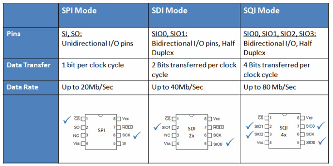 SQI模式下,全部4個引腳(引腳2、4、5和7)均配置為可隨時高效進行讀或?qū)懖僮鳎_保在一個時鐘周期內(nèi)通過總線傳輸4位,這實際上會獲得4倍數(shù)據(jù)速率。例如,標(biāo)準(zhǔn)SPI模式下需花費40個時鐘周期才能完成的任務(wù)現(xiàn)在可以在40/4 = 10個時鐘周期內(nèi)完成。 需要快速傳輸大量數(shù)據(jù)時,該功能十分有用。