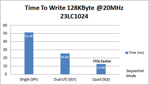 下圖給出了在SPI、SDI和SQI模式下以20 MHz向23LC1024 1 Mb SPI SRAM寫入128 KB存儲內(nèi)容所需的時間。 從中可看出,SQI比標(biāo)準(zhǔn)SPI快75%。